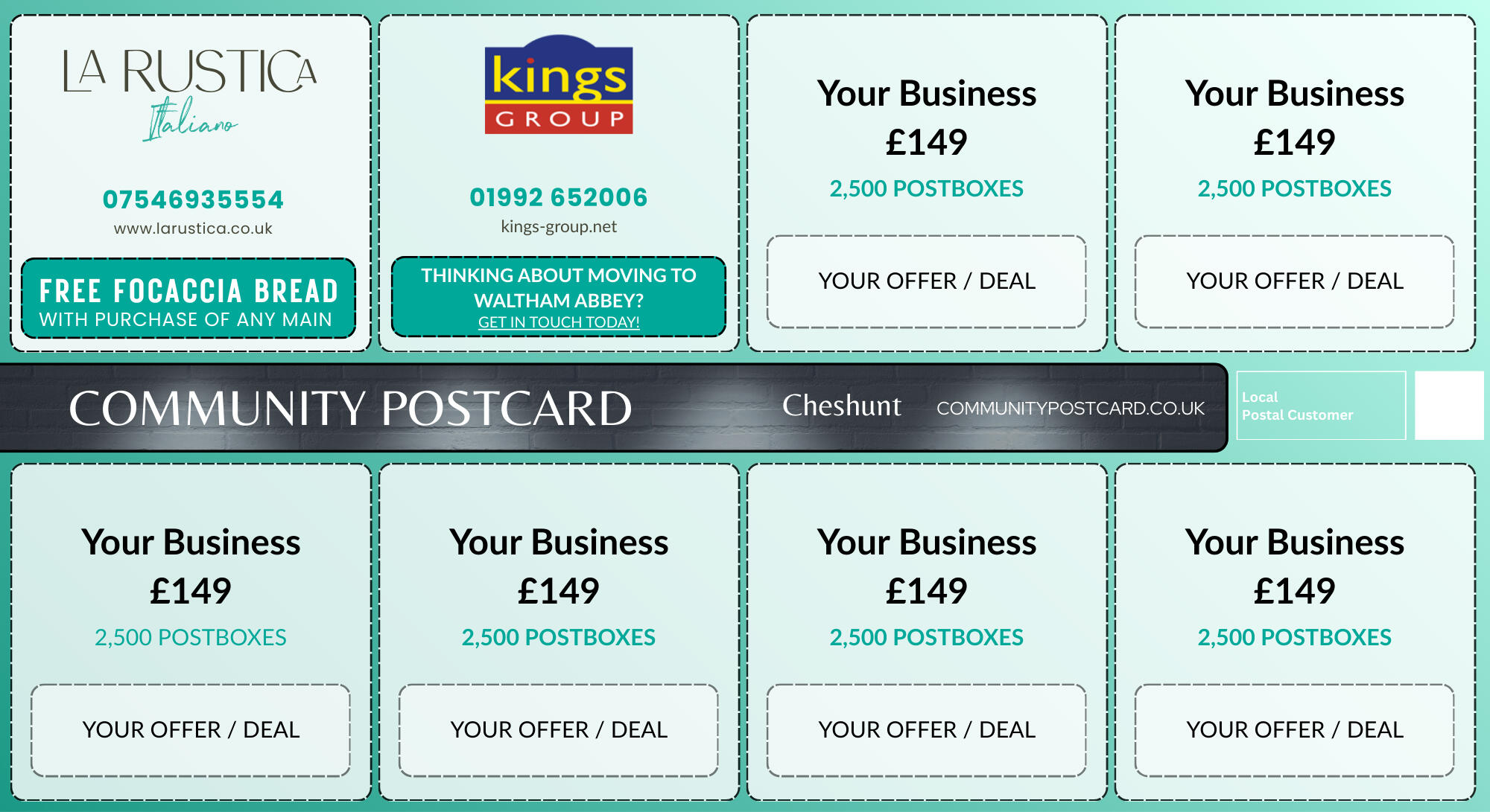 Each postcard features multiple local businesses, all offering different services.